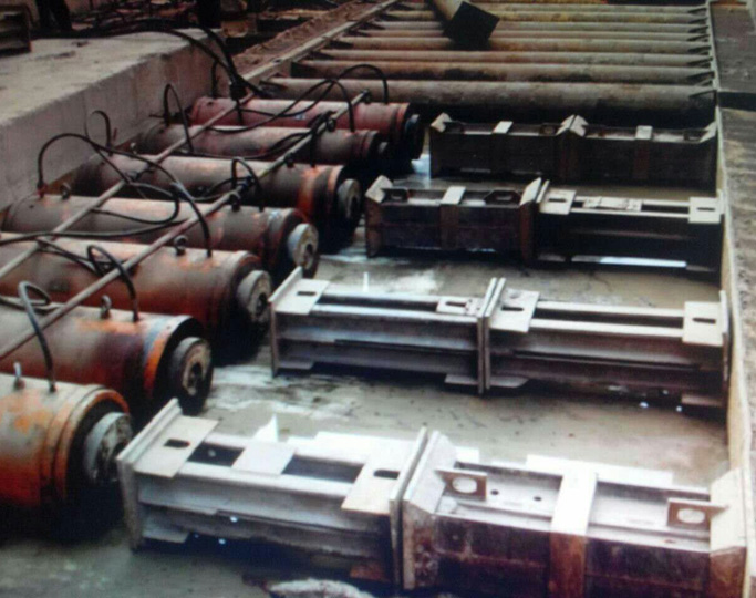 通過中間的小千斤頂的伸動作推動外套往前伸出,外套向前推動管節(jié)一段距離。